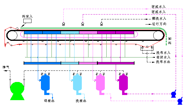 以濾布為過濾介質(zhì),采用整體的環(huán)形橡膠帶作為真空室。環(huán)形橡膠帶由傳動(dòng)裝置傳動(dòng)做直線運(yùn)行,通過密封系統(tǒng)實(shí)現(xiàn)料漿的固液分離。當(dāng)真空系統(tǒng)介入時(shí),固體被載流在濾帶上通過刮刀卸除,液體被自動(dòng)排液罐接收并通過水封裝置或切換裝置排出,濾布經(jīng)過高壓沖洗液在線連續(xù)清洗獲得再生。實(shí)現(xiàn)物料從進(jìn)料、脫水、順逆流洗滌、卸渣、濾液排放、濾布清洗和糾偏不間斷的連續(xù)進(jìn)行。